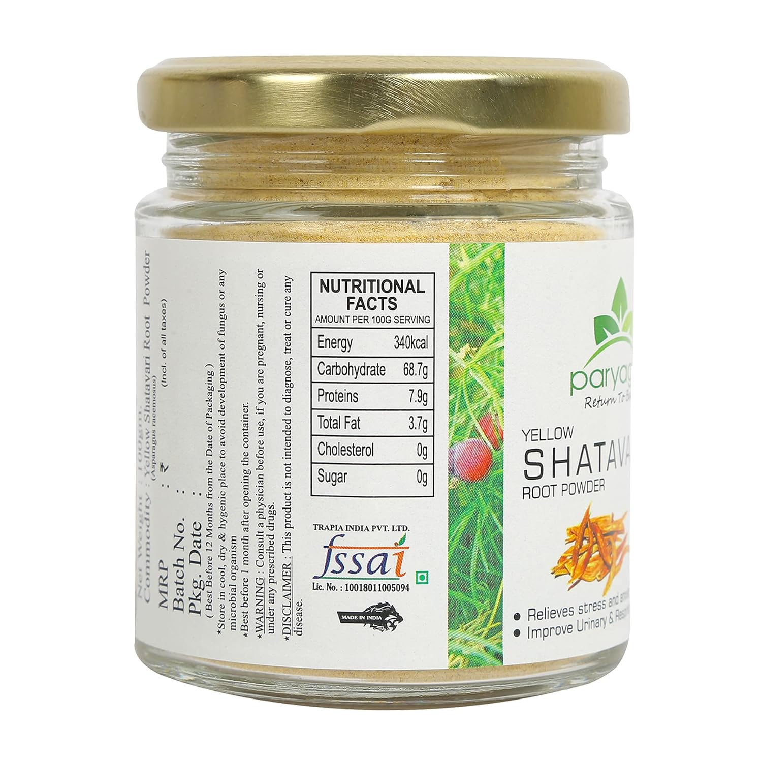 About this item INGREDIENTS: Paryagat Yellow Shatavari Root Powder is naturally sourced. No Preservatives used. It has antioxidant, anti-inflammatory properties, which boosts immune system. BENEFITS: Cooling effect of Shatavari root powder soothes the stomach and digestive tract, helping with physical digestion. Its healing feature likewise soothes many part of human body. KEEPS YOU CALM: You will feel more relaxed and satisfied as it calms you. One of the most powerful herbs for renewing and invigorating the body, mind, and spirit. BOON FOR FEMALE: It restores hormonal balance in the body due to menstruation. Supports reproductive health by toning & nourishing the female reproductive organs & increases milk Supply.